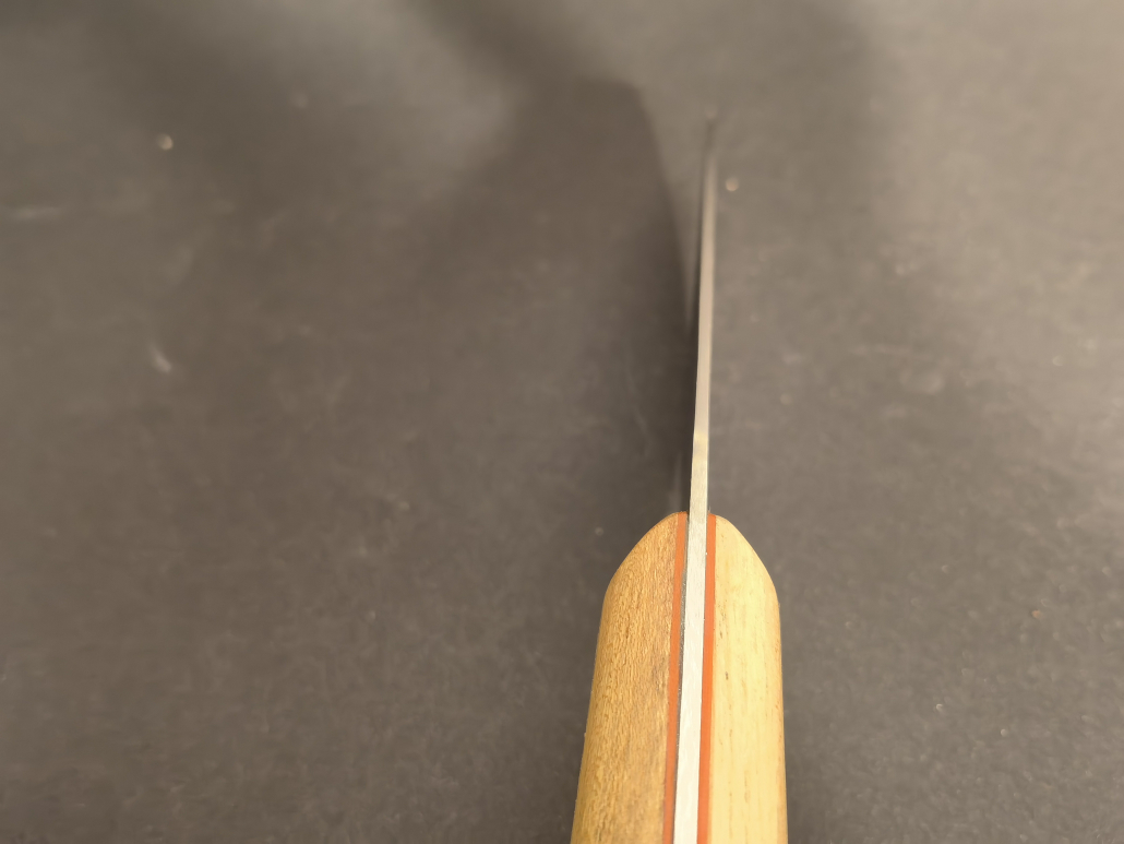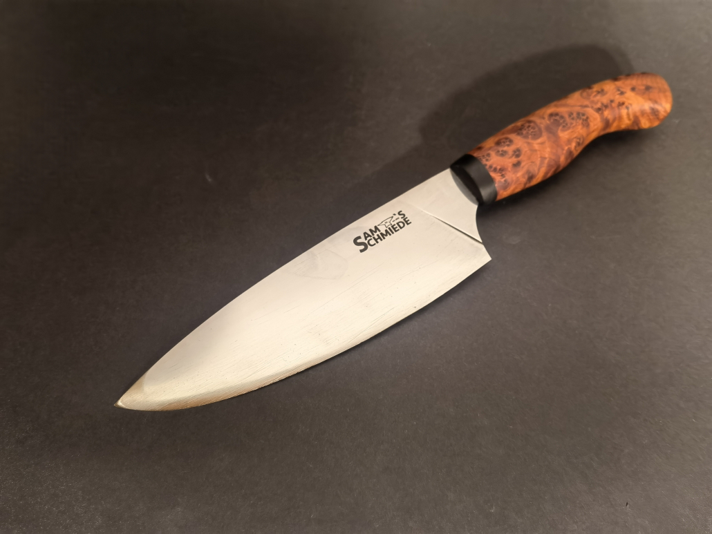 Das hier gezeigte Kochmesser hat eine Klingenlänge von 21 Zentimetern und liegt mit einem Gewicht von 220 Gramm im mittleren Bereich der als Kochmesser definierten Schneidwerkzeuge. Der Griff besteht aus einer Kombination von Thuja- und Grenadillholz, die es in Verbindung mit dem handgeschmiedeten Böhler M390 Stahl zu einem echten Hingucker machen.